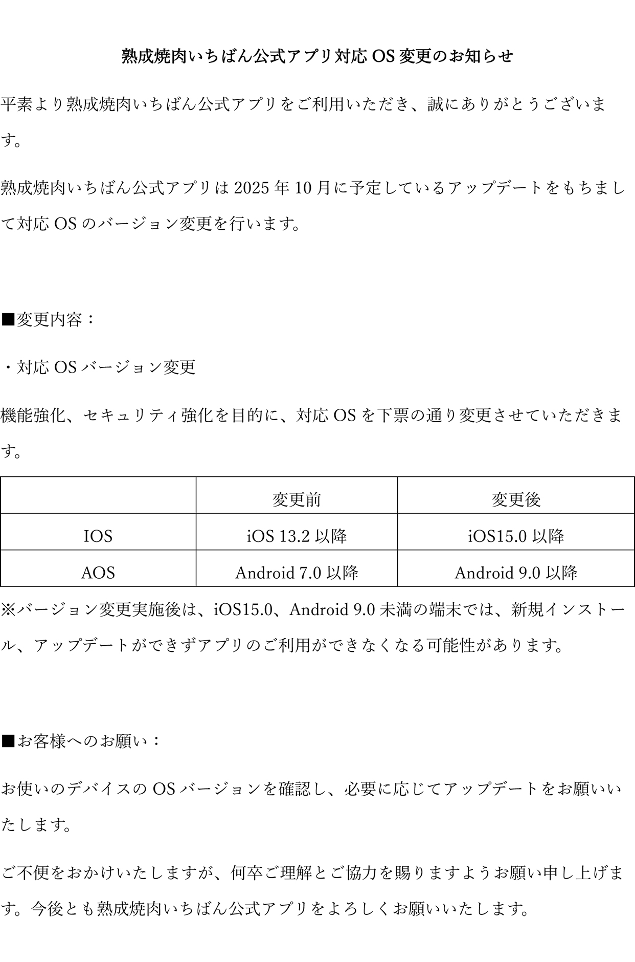 熟成焼肉いちばん公式アプリ 対応OS変更のお知らせ